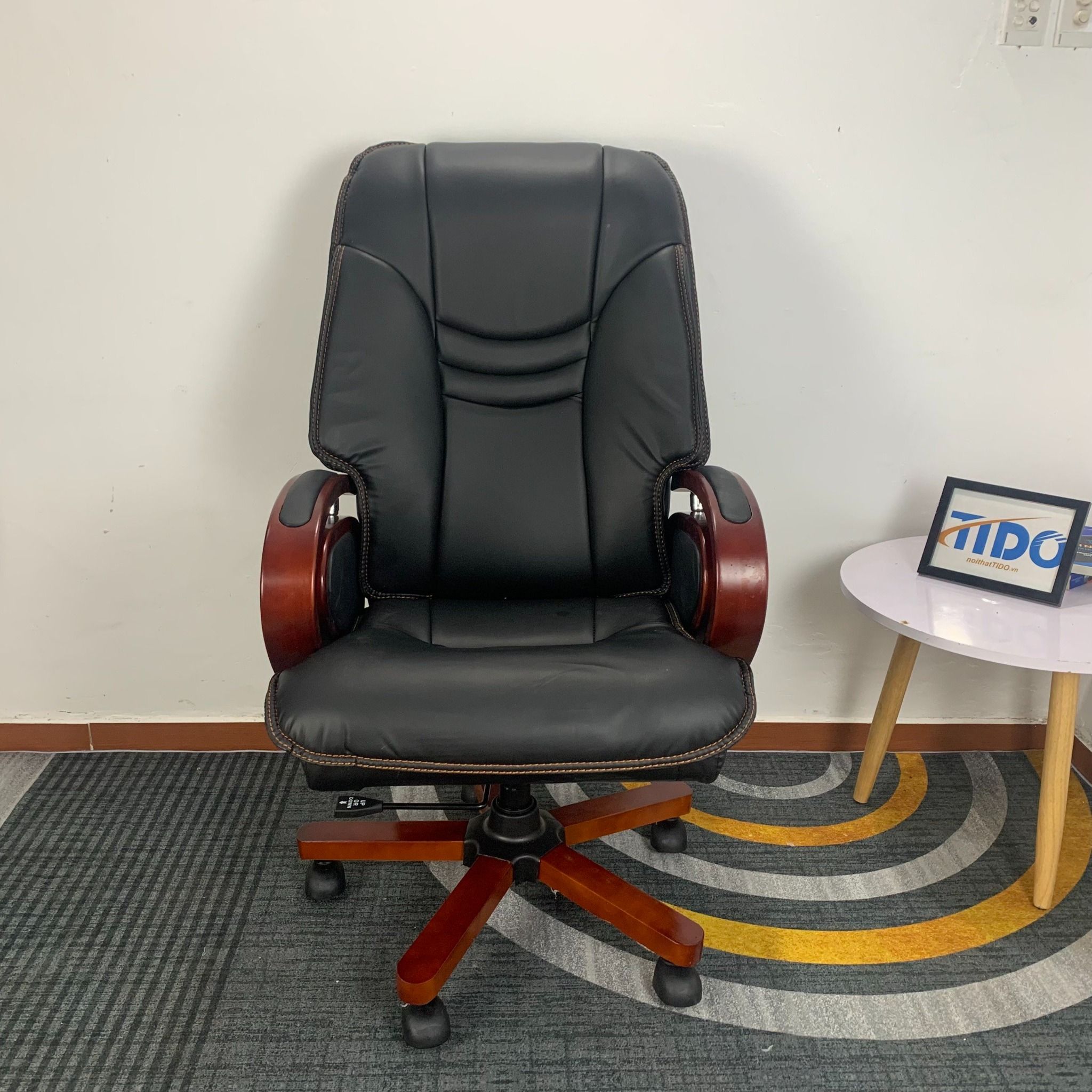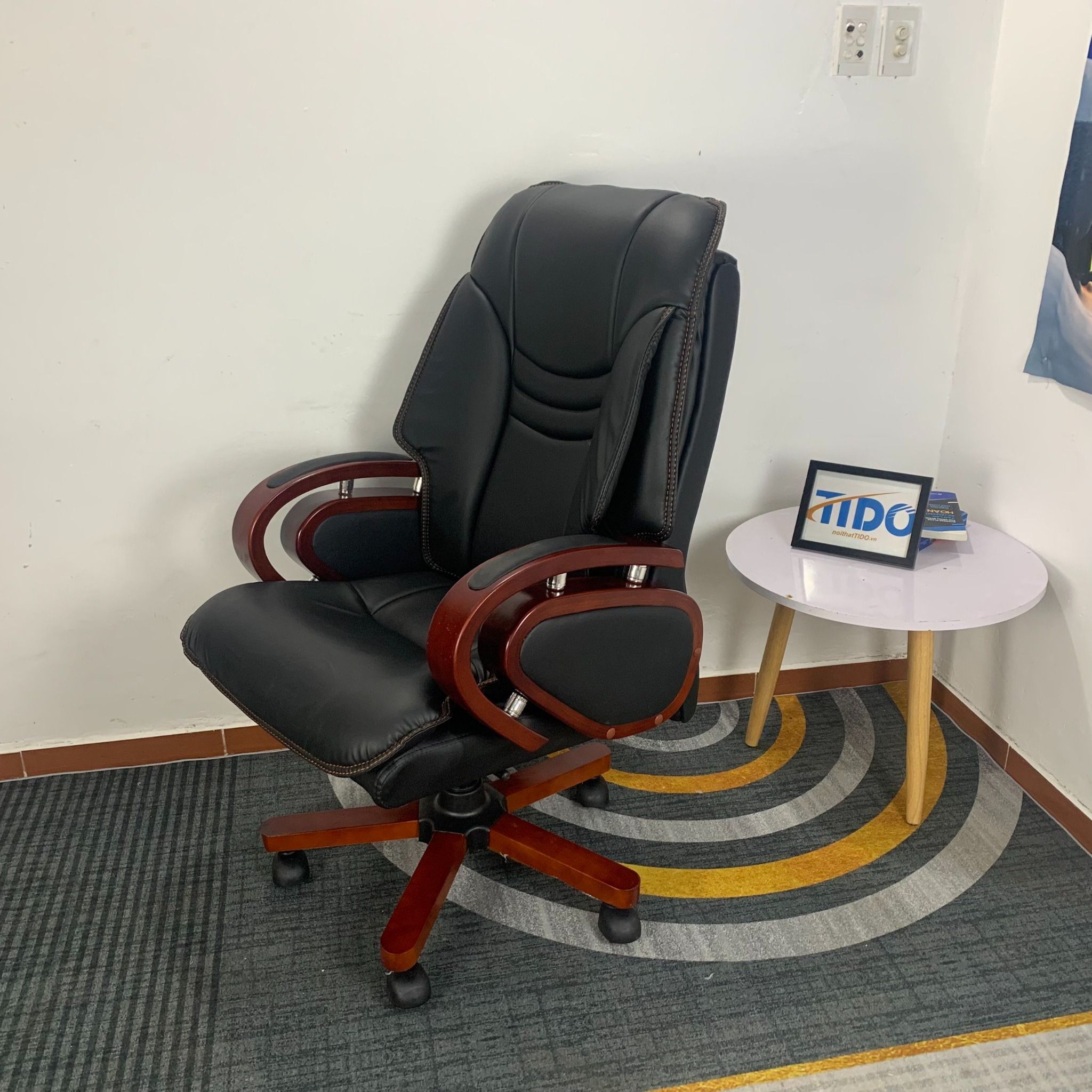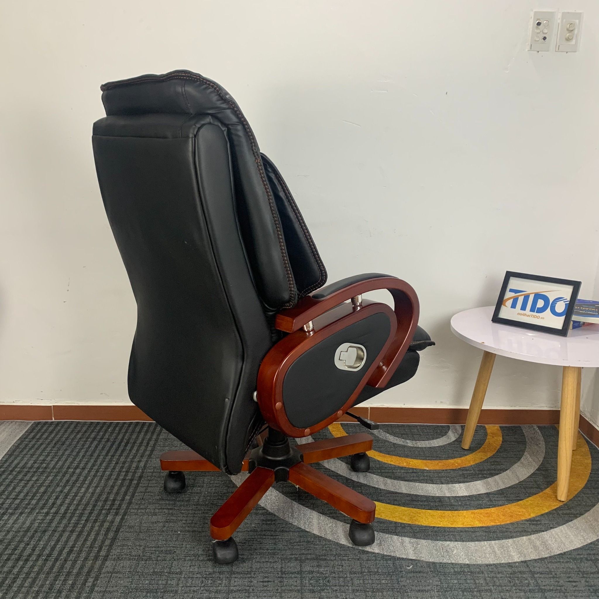 - Chất liệu: tay gỗ tự nhiên, da cao cấp, chân thép ép gỗ.